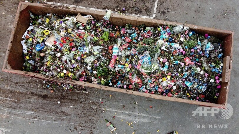 チューリップやバラ、菊などの花の山々が、先週から処分を待っていた。ロマンチックな演出や母の日のプレゼントとして贈られるはずだった色鮮やかな花々は、掘削機にすくい上げられ、大きな廃棄物用コンテナに捨てられていく。