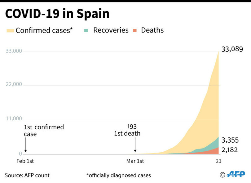 3番目に被害が大きな国はスペインで、死者は2182人、感染者は3万3089人。次いでイラン(死亡1812人、感染2万3049人)、フランス(死亡860人、感染1万9856人)、米国(死亡499人、感染4万1511人)となっている。
