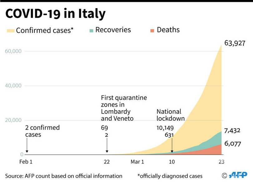 2月に国内初の死者が出たイタリアでは、累計死者数が中国を上回る6077人となっている。感染者数は6万3927人で、うち7432人が回復した。