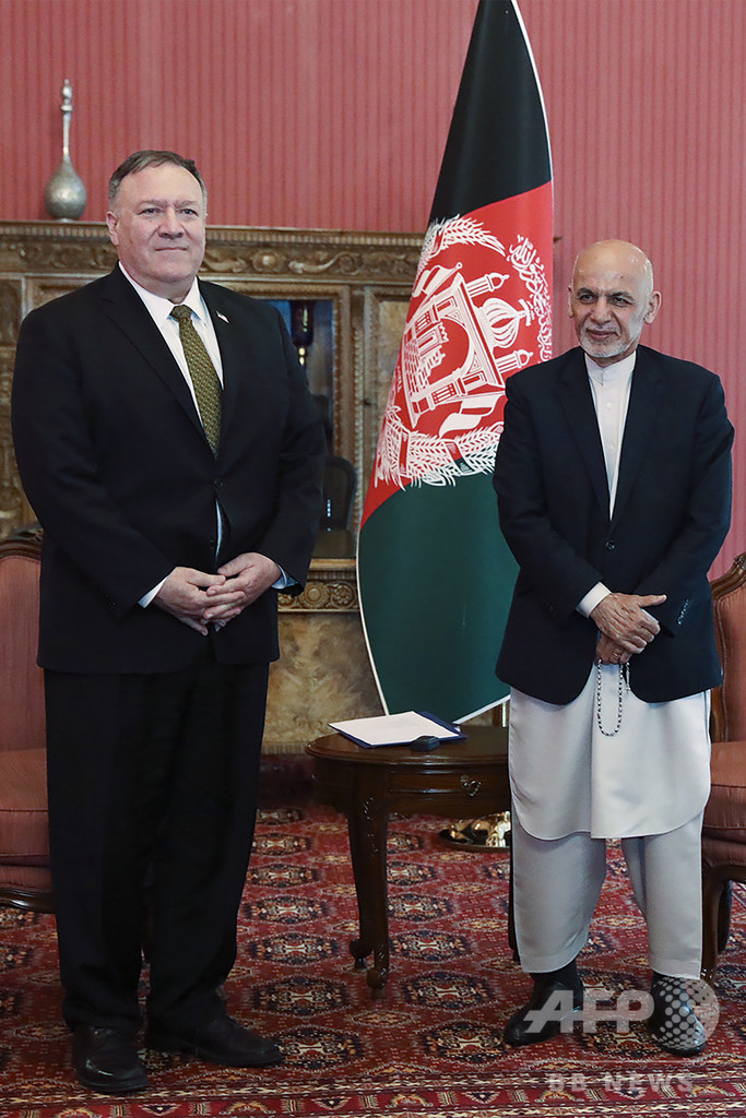 【3月24日 AFP】米国のマイク・ポンペオ(Mike Pompeo)国務長官は23日、アフガニスタンを電撃訪問し、アシュラフ・ガニ(Ashraf Ghani)大統領および対立するアブドラ・アブドラ(Abdullah Abdullah)氏と面会した後、アフガニスタン向けの支援金10億ドル(約1100億円)を直ちに削減すると発表した。ポンペオはさらに帰途、カタールの首都ドーハにも立ち寄り、アフガニスタンの旧支配勢力タリバン(Taliban)の幹部らと会談した。