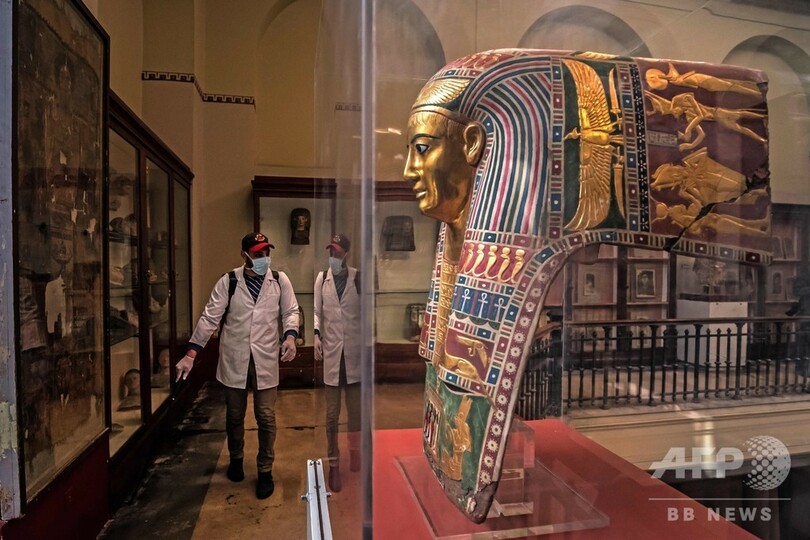 白衣に手袋、マスクを着用した作業員たちは、エジプトの先史時代からローマ(Roman)時代にかけての貴重な遺物が多数収蔵されている広大な博物館内のあちこちで、殺菌剤をまいた。