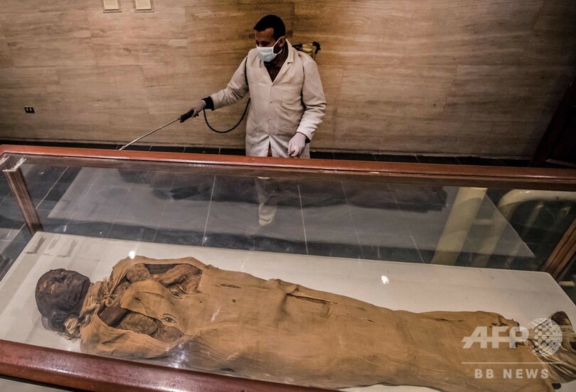 ミイラのそばで消毒作業、エジプト考古学博物館