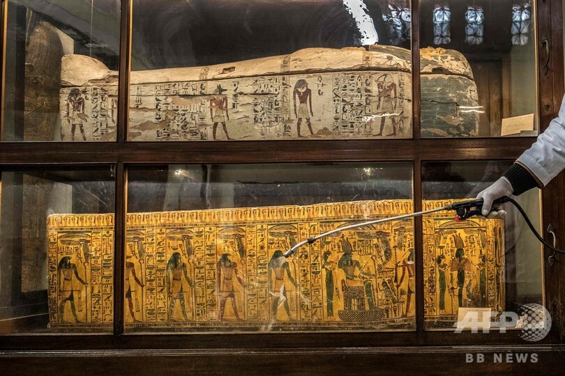 ミイラのそばで消毒作業、エジプト考古学博物館