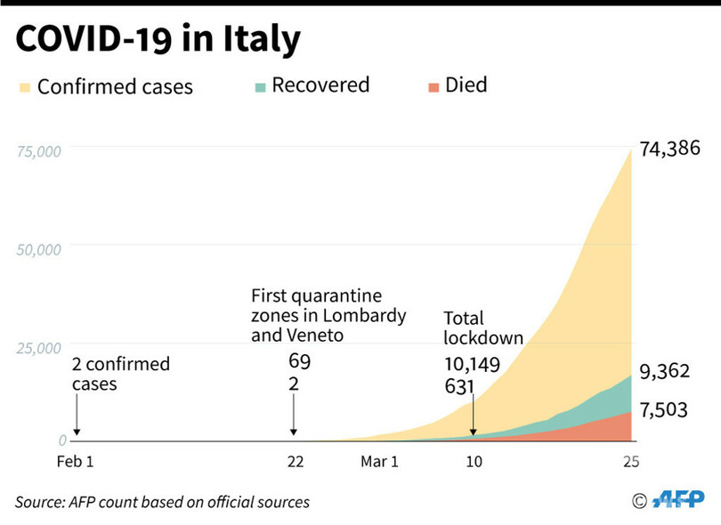 【3月26日 AFP】イタリアで新型コロナウイルスの感染者増加率が25日、4日連続で減少したことが明らかになった。長期の厳格な封鎖がパンデミック(世界的な大流行)に有効であることを示す新たな証拠だ。