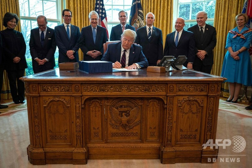 与野党は1週間に及んだ攻防の末に同法案を支持し、法案は大統領が署名する数時間前に下院で可決されていた。経済対策では平均的な4人家族に最大3400ドル(約37万4000円)を給付する。