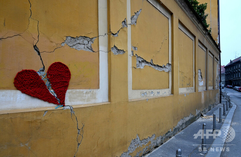 【3月30日 AFP】クロアチアの首都ザグレブ中心部にある、毛糸で編んだハート形のモチーフで修繕された建物の壁。同国のデザイナー、イボナ(Ivona)さんが手がけた。