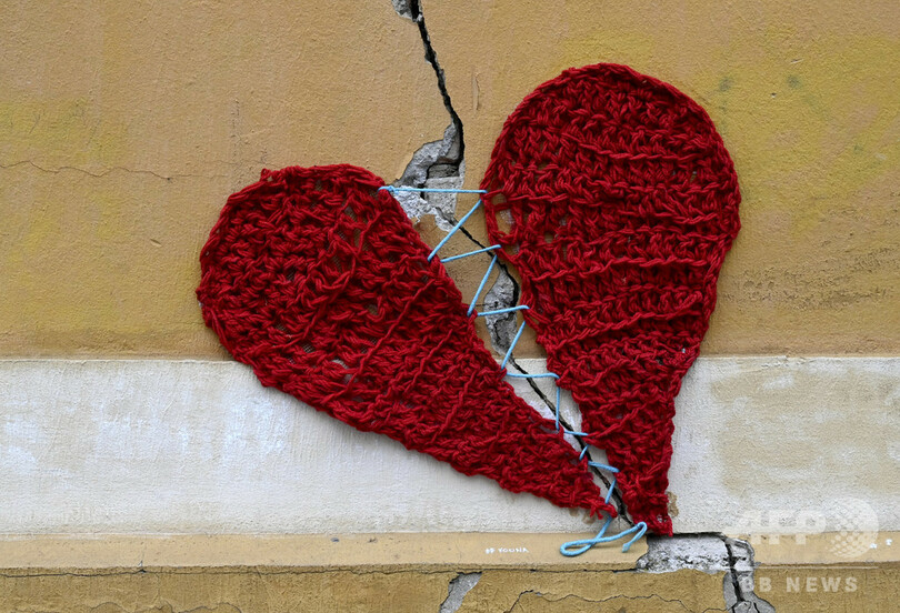 【3月30日 AFP】クロアチアの首都ザグレブ中心部にある、毛糸で編んだハート形のモチーフで修繕された建物の壁。同国のデザイナー、イボナ(Ivona)さんが手がけた。