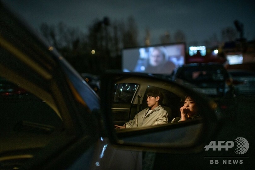 一方、映画ファンはドライブインシアターに出かけ、自家用車の中でくつろぎながら、屋外に設置された巨大スクリーンで映画を楽しんでいる。(c)AFP