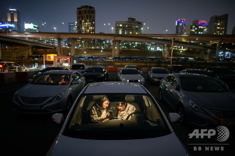 【4月1日 AFP】韓国・ソウルにあるドライブインシアターで、車に乗ったままスクリーンを眺めるカップル。韓国では、新型コロナウイルスによる感染症を防ぐため、当局が人混みを避けるよう市民に呼びかけており、ここ数週間で映画の興行収入が激減した。