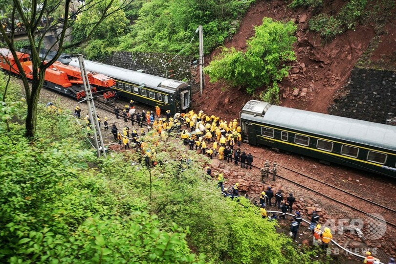 【3月30日 AFP】(更新、写真追加)中国中部・湖南(Hunan)省で30日、走行中の旅客列車が線路に崩落していた土砂に衝突して脱線し、1人が死亡、127人が負傷した。国営鉄道会社が明らかにした。