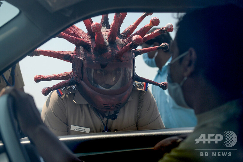 【4月8日 AFP】インド南部チェンナイ(Chennai)に設けられた検問所で、コロナウイルスをモチーフにしたヘルメットをかぶり、ドライバーに話しかけるラジェシュ・バーブ(Rajesh Babu)警部。
