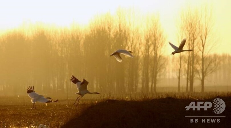 湿地公園では3月12日から渡り鳥が目撃され、珍しい鳥も含まれている。ソデグロヅルは国際自然保護連合(IUCN)の鳥類絶滅危惧種にリストアップされており、中国でも一級重点保護動物だ。現在生息しているのは世界でわずか3000羽ほど。獾子洞国家湿地公園にはピーク時に2000羽以上がおり、世界の7割を占める。3か月以上もとどまるため、法庫県は「ソデグロヅルの郷」と知られている。(c)CNS/JCM/AFPBB News