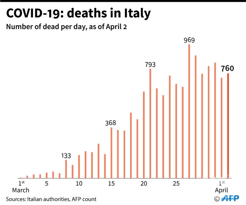 次に被害が大きなスペインの死者数は1万3人、感染者数は11万238人。その次は米国(死者5607人、感染者23万4462人)。香港とマカオ(Macau)を除く中国本土は死者3318人、感染者8万1589人となっている。(c)AFP