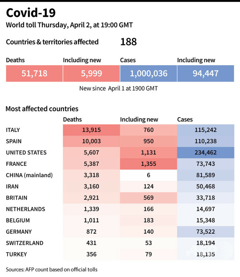 【4月3日 AFP】AFPが各国当局の発表に基づき日本時間3日午前4時にまとめた統計によると、世界の新型コロナウイルスによる死者数は5万1718人となっている。