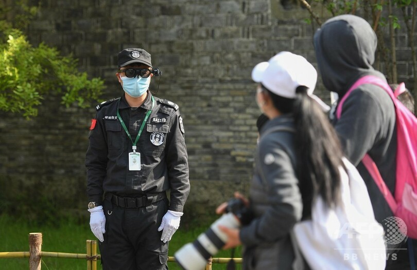 【4月8日 CNS】中国・浙江省(Zhejiang)杭州市(Hangzhou)の国家級湿地公園である「西渓(Xixi)湿地公園」で、新型コロナウイルスの感染対策のため、警備員が体温測定機能付き拡張現実(AR)眼鏡を使い、来園者の体温を遠隔測定していた。