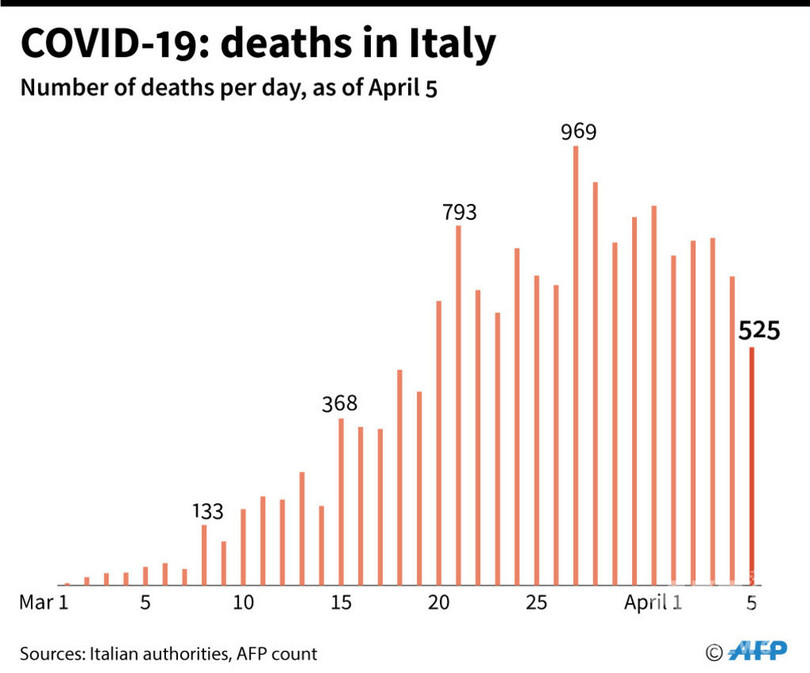 5日午前4時の集計以降、新たに4690人の死亡と7万5522人の感染が発表された。死者の増加幅が大きかった国は、上位から米国(1082人)、スペイン(674人)、英国(621人)。