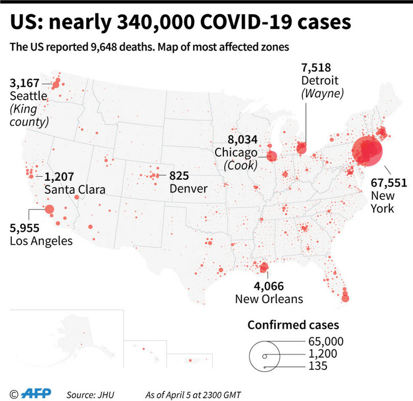 世界の新型コロナウイルスによる死者・感染者数を集計している同大によると、米国の感染者は少なくとも34万7003人で、うち1万335人が死亡した。(c)AFP