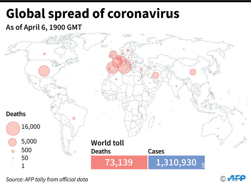 【4月7日 AFP】AFPが各国当局の発表に基づき日本時間7日午前4時にまとめた統計によると、世界の新型コロナウイルスによる死者数は7万3139人となっている。