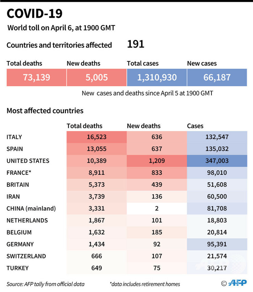 【4月7日 AFP】AFPが各国当局の発表に基づき日本時間7日午前4時にまとめた統計によると、世界の新型コロナウイルスによる死者数は7万3139人となっている。