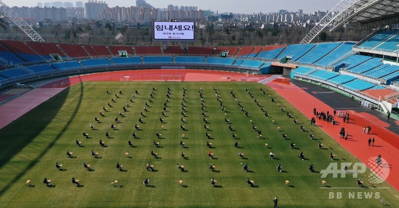 韓国、サッカー場で採用試験 コロナ対策で
