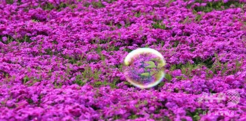 薄紅色や白色のシバザクラの群落が水や山の緑や青と絶妙にマッチし、人の心をリラックスさせ、幸せな気分が感じられる景色だった。(c)CNS/JCM/AFPBB News