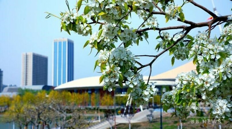 純白の花びらと都市の景観がマッチし、最近はSNSで写真をアップする人も多く、春のコルラ市の「映える観光スポット」として評判になっている。(c)CNS/JCM/AFPBB News