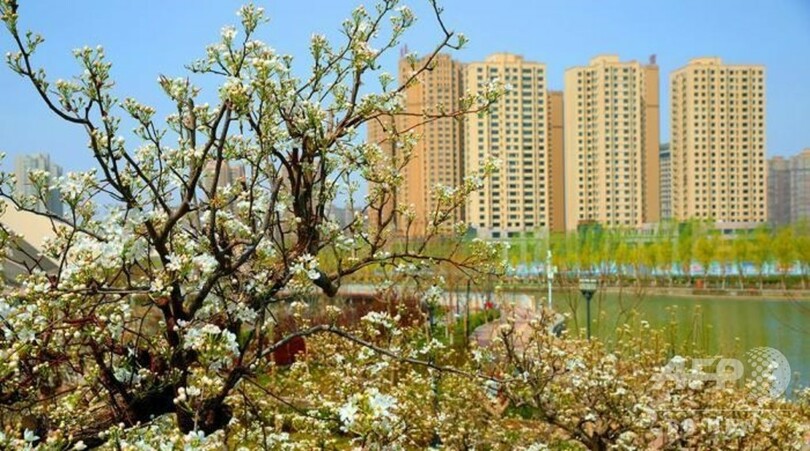 純白の花びらと都市の景観がマッチし、最近はSNSで写真をアップする人も多く、春のコルラ市の「映える観光スポット」として評判になっている。(c)CNS/JCM/AFPBB News