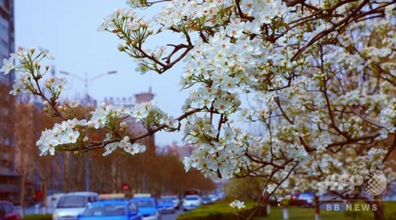 純白の花びらと都市の景観がマッチし、最近はSNSで写真をアップする人も多く、春のコルラ市の「映える観光スポット」として評判になっている。(c)CNS/JCM/AFPBB News
