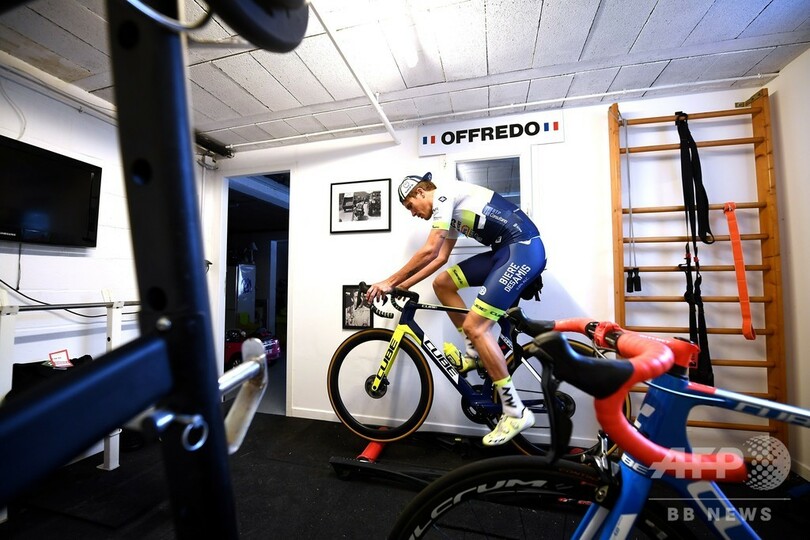 自転車ロードレーサーのヨアン・オフルド(Yoann Offredo、フランス)は、パリ南部にある自宅の地下室に自転車を固定し、シーズンが再開されるのを期待しながら練習に励んでいる。