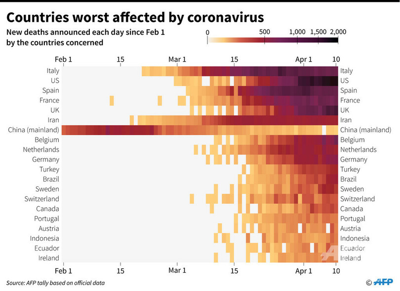 【4月12日 AFP】米ジョンズ・ホプキンス大学(Johns Hopkins University)の集計によると、米国の新型コロナウイルスによる死者数は11日、2万人を超え、イタリアを抜いて世界最多となった。