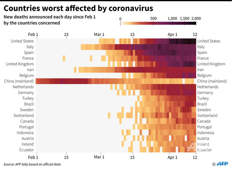 死者数と感染者数が最も多い国は米国で、2万2935人が死亡、56万8176人の感染が確認された。