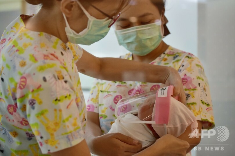 【4月14日 AFP】新型コロナウイルスが世界的に大流行する中、タイ首都バンコク各地の病院では、産科病棟での感染防止策として新生児用のフェースシールドが導入されている。