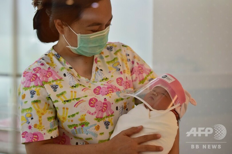 【4月14日 AFP】新型コロナウイルスが世界的に大流行する中、タイ首都バンコク各地の病院では、産科病棟での感染防止策として新生児用のフェースシールドが導入されている。