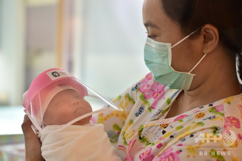 【4月14日 AFP】新型コロナウイルスが世界的に大流行する中、タイ首都バンコク各地の病院では、産科病棟での感染防止策として新生児用のフェースシールドが導入されている。