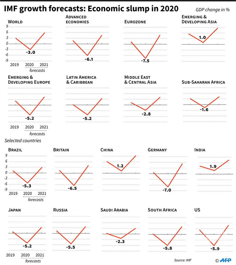 【4月15日 AFP】国際通貨基金(IMF)は14日、最新の世界経済見通しを公表し、新型コロナウイルスのパンデミック(世界的な大流行)により世界経済は1930年代の世界大恐慌(Great Depression)以来最悪の景気後退に陥るとの見解を示した。IMFは2020年の成長率がマイナス3%となるとの予測を示した上で、危機はさらに悪化する恐れがあるとも警告した。