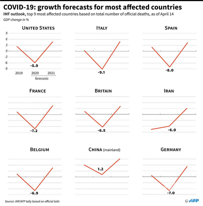 【4月15日 AFP】国際通貨基金(IMF)は14日、最新の世界経済見通しを公表し、新型コロナウイルスのパンデミック(世界的な大流行)により世界経済は1930年代の世界大恐慌(Great Depression)以来最悪の景気後退に陥るとの見解を示した。IMFは2020年の成長率がマイナス3%となるとの予測を示した上で、危機はさらに悪化する恐れがあるとも警告した。