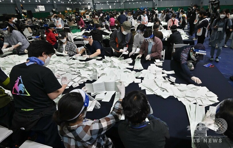 【4月15日 AFP】韓国で15日に投票が行われた総選挙で、文在寅(ムン・ジェイン、Moon Jae-in)大統領率いる与党が過半数の議席を獲得する見通しとなった。投票所でマスクと手袋の着用を義務付けられた有権者らは、文大統領の新型コロナウイルス感染拡大防止対策を評価した形だ。