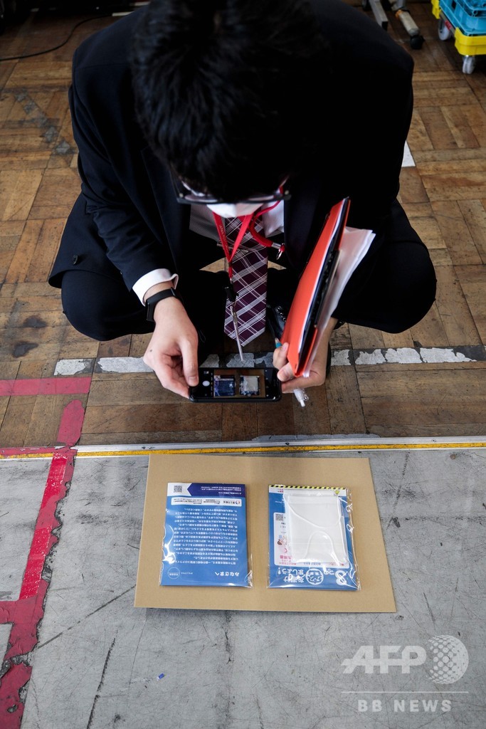 【4月16日 AFP】安倍晋三(Shinzo Abe)政権が新型コロナウイルス感染症(COVID-19) の予防策として全世帯に配布を決めた布製マスクが16日、都内の郵便局に到着した。