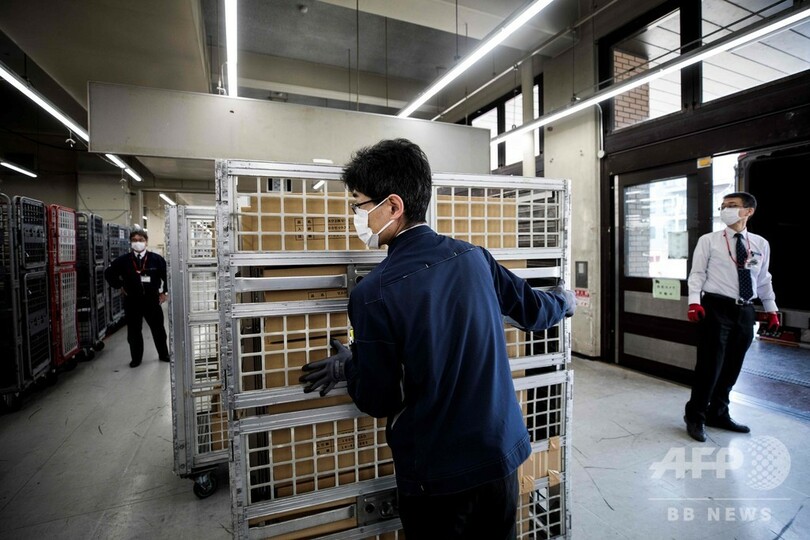 【4月16日 AFP】安倍晋三(Shinzo Abe)政権が新型コロナウイルス感染症(COVID-19) の予防策として全世帯に配布を決めた布製マスクが16日、都内の郵便局に到着した。