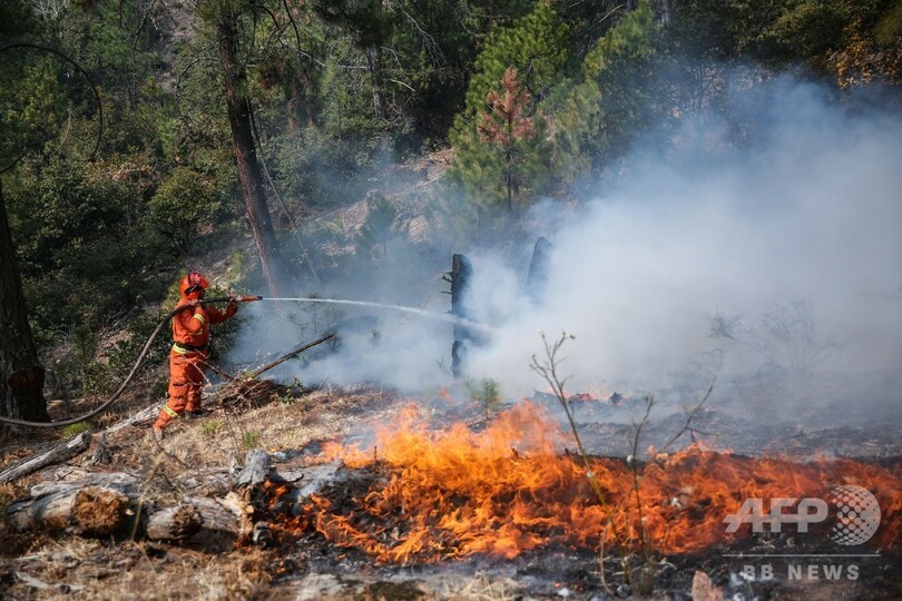 火災現場は勾配がきつい上、風が強く、長らく雨が降っておらず非常に乾燥しているため、15日午後4時すぎ、一部で再燃した。午後7時、全ての隊員はいったん安全地域まで後退し、地元住民115世帯435人を避難させた。(c)CNS/JCM/AFPBB News