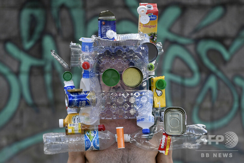 【4月19日 AFP】ブラジル東部ベロオリゾンテ(Belo Horizonte)で、リサイクル資源のボトルや缶、箱でできたマスクを身につけた同国のファッションフォトグラファー、マルシオ・ロドリゲス(Marcio Rodrigues)さん。