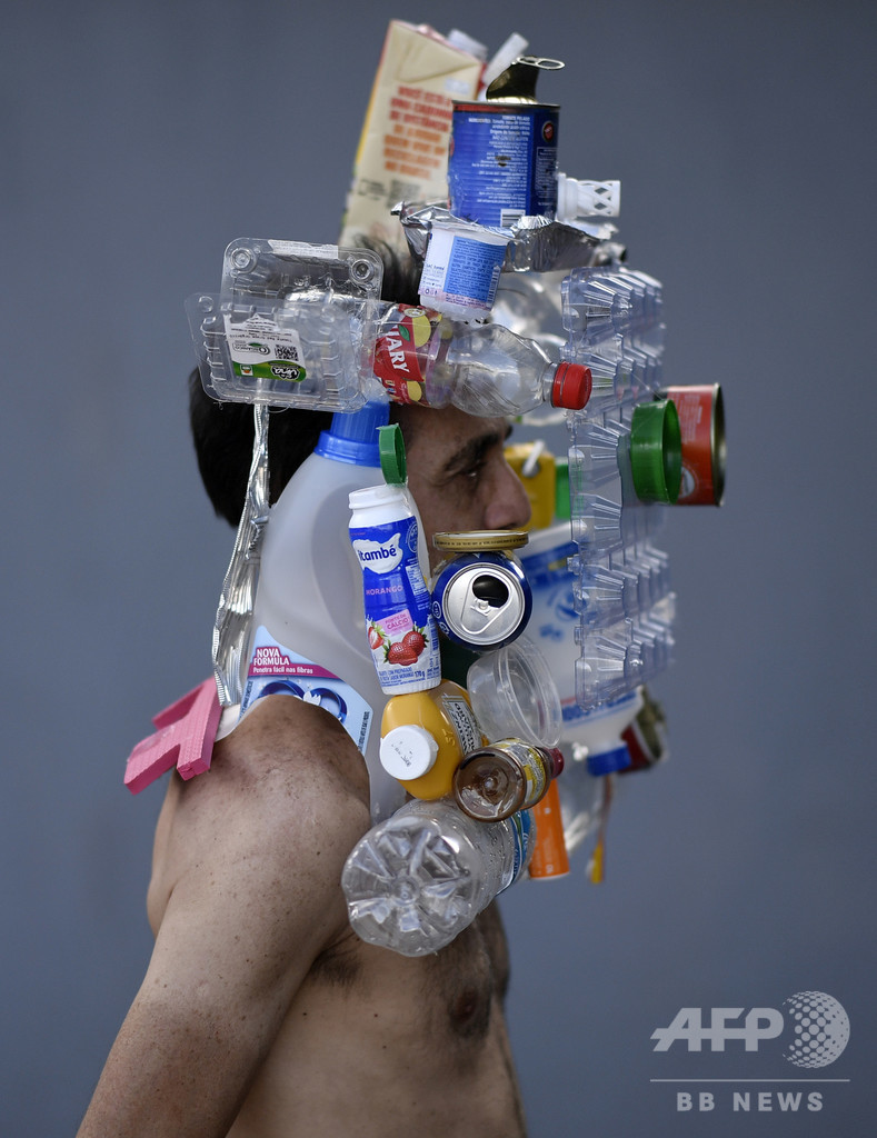 【4月19日 AFP】ブラジル東部ベロオリゾンテ(Belo Horizonte)で、リサイクル資源のボトルや缶、箱でできたマスクを身につけた同国のファッションフォトグラファー、マルシオ・ロドリゲス(Marcio Rodrigues)さん。