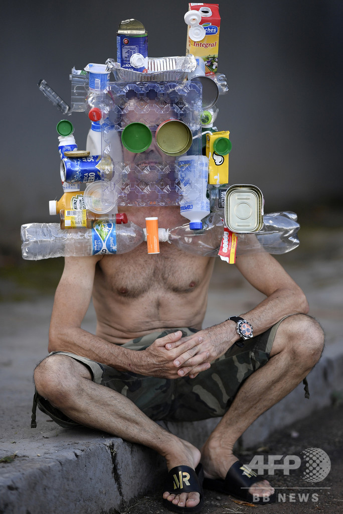 【4月19日 AFP】ブラジル東部ベロオリゾンテ(Belo Horizonte)で、リサイクル資源のボトルや缶、箱でできたマスクを身につけた同国のファッションフォトグラファー、マルシオ・ロドリゲス(Marcio Rodrigues)さん。