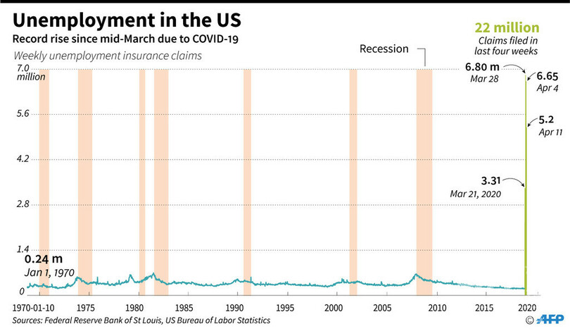米国では、ウイルス拡大阻止のため発令された休業や移動制限の命令により、多くの人が職を失っている。米労働省が16日に発表した失業保険の週間新規申請件数からは、米企業が先週、新たに520万人を解雇したことが示された。