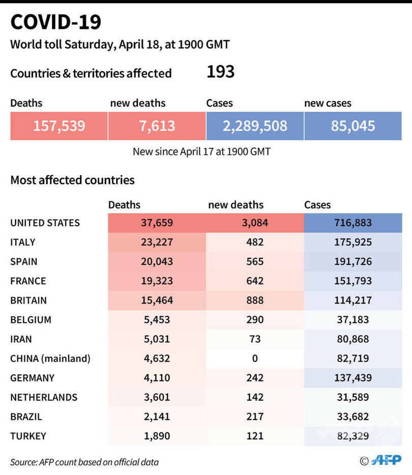 【4月19日 AFP】AFPが各国当局の発表に基づき日本時間19日午前4時にまとめた統計によると、世界の新型コロナウイルスによる死者数は15万7539人に増加した。