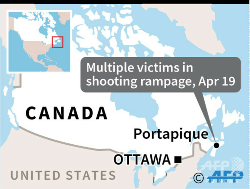 【4月20日 AFP】(更新)カナダ東部ノバスコシア(Nova Scotia)州で18日夜から19日にかけて銃撃があり、少なくとも16人が死亡した。カナダ騎馬警察(RCMP、連邦警察)が19日、明らかにした。容疑者の男は警察に射殺された。カナダで発生した銃撃事件の死者数としては過去最悪。