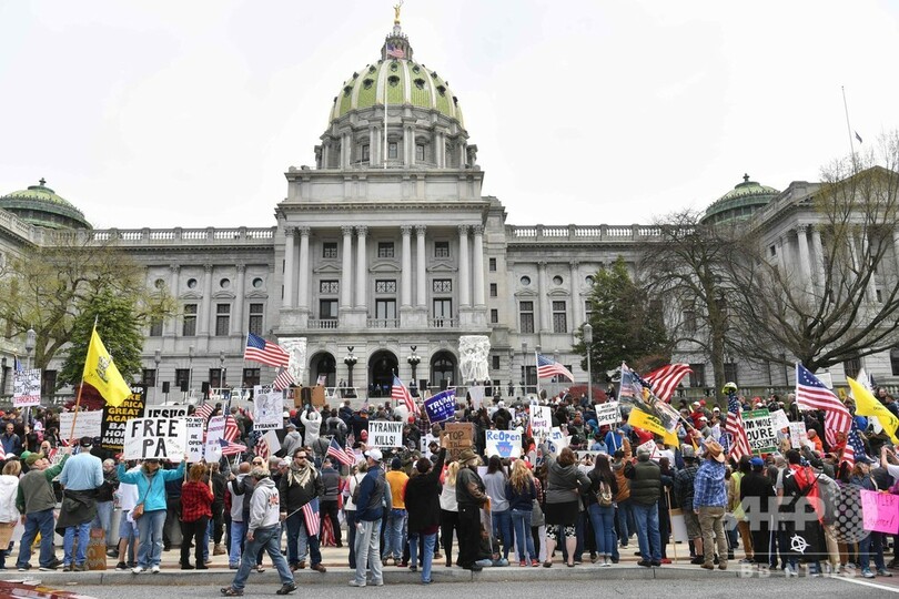 中でも大きな抗議が起きているペンシルベニア州の州都ハリスバーグ(Harrisburg)では20日、数百人が集まり、州政府の外出制限は個人の自由を制限し、経済に損害を与えるものだと主張した。多くの人はマスクを着用せずに参加していた。