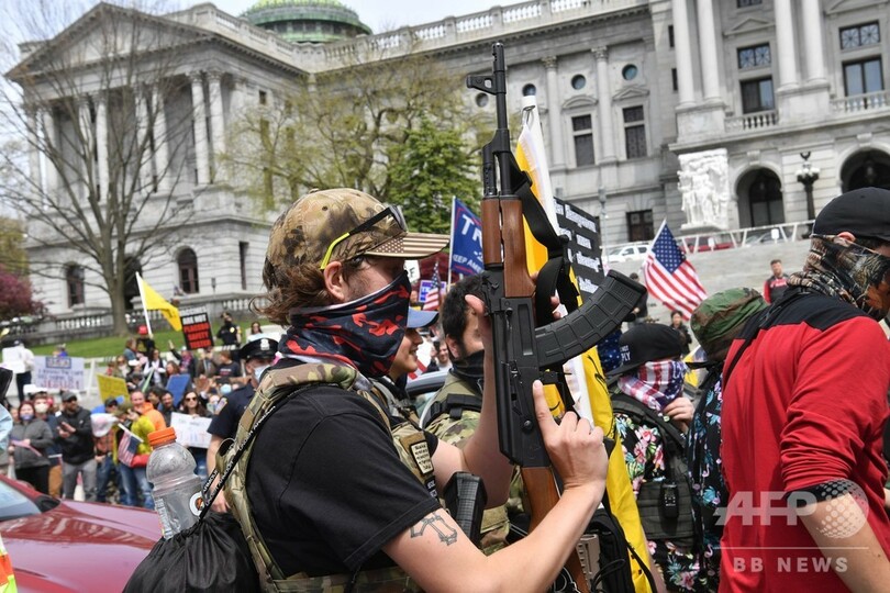 米衛生当局関係者らは、拙速な外出制限解除によって新型ウイルスの流行が再燃するリスクがあると警告しているが、ドナルド・トランプ(Donald Trump)米大統領はこうした外出制限に対する抗議デモを激励している。(c)AFP/Michael Mathes, with Catherine Triomphe in Harrisburg and AFP bureaus
