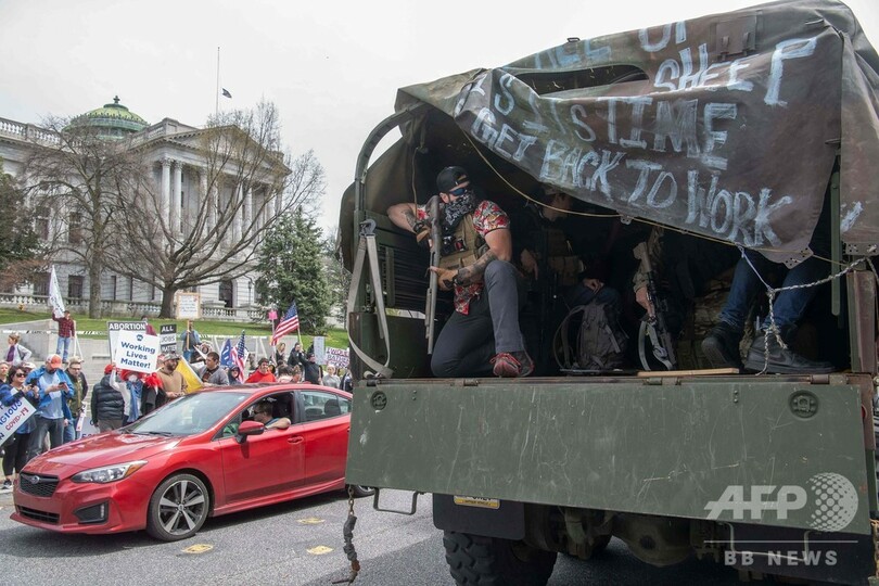 米衛生当局関係者らは、拙速な外出制限解除によって新型ウイルスの流行が再燃するリスクがあると警告しているが、ドナルド・トランプ(Donald Trump)米大統領はこうした外出制限に対する抗議デモを激励している。(c)AFP/Michael Mathes, with Catherine Triomphe in Harrisburg and AFP bureaus