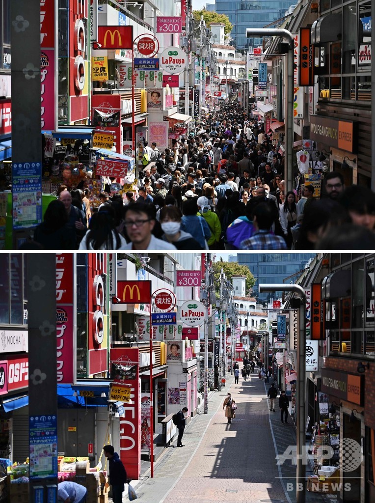 安倍晋三(Shinzo Abe)首相は、人との接触を通常の7割から8割まで減らすよう呼び掛けており、いつもは混み合っている都内の交通機関もかなりすいている。しかし、緊急事態宣言による外出自粛効果は薄く、多くの商店や飲食店が営業を続けている。(c)AFP
